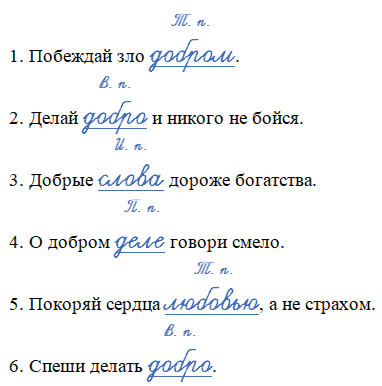 1. Побеждай зло ___. 2. Делай ___ и никого не бойся. 3. Добрые ___ дороже богатства. 4. О добром ___ говори смело. 5. Покоряй сердца ___, а не страхом. 6. Спеши делать ___.
