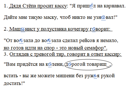 1. Дядя Стёпа просит кассу: "Я приш_л на карнавал. Дайте мне такую маску, чтоб никто не узн_вал!" 2. Маш_нист у полустанка кочегару г_ворит: "От во_зала до во_зала сделал рейсов я немало, но готов идти на спор - это новый семафор". 3. Оглядев с тревогой тир, говорит в ответ кассир: "Вам придётся на к_лени, д_рогой товарищ_, встать - вы же можете мишени без руж_я рукой достать!"
