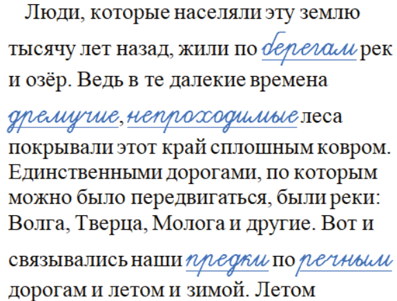 Люди, которые населяли эту землю тысячу лет назад, жили по ________ рек и озёр. Ведь в те далекие времена ________ , ________ леса покрывали этот край сплошным ковром. Единственными дорогами, по которым можно было передвигаться, были реки: Волга, Тверца, Молога и другие. Вот и связывались наши ________ по ________ дорогам и летом и зимой. Летом _____ по воде на лодках, ездили в гости, приезжали друг к другу узнать новости.