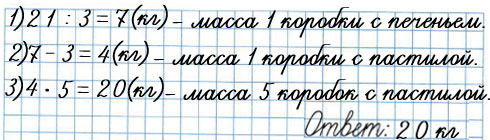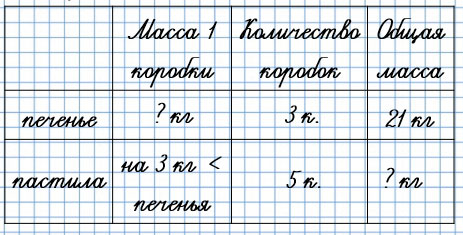 43. Масса трёх одинаковых по массе коробок с печеньем равна 21 кг. Коробка с пастилой на 3 кг легче коробки с печеньем. Чему равна масса 5 таких коробок с пастилой?