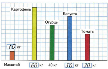 Масштабу, в котором построена диаграмма соответствуют две клетки. По данным диаграммы видно, что огурцов собрали 40 кг. Огурцы занимают 8 клеточек. 8 : 2 = 4, значит масштаб диаграммы: