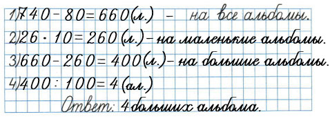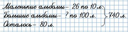 111. Из 740 листов бумаги сделали 26 маленьких альбомов, по 10 листов в каждом, и несколько больших альбомов, по 100 листов в каждом, после чего осталось ещё 80 листов бумаги. Сколько сделали больших альбомов? Запиши решение задачи по действиям с пояснениями.