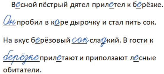 В_сной пёстрый дятел прил_тел к б_рёзке. _ пробил в к_ре дырочку и стал пить сок. На вкус б_рёзовый __ сла_кий. В гости к __ прил_тают и прип_лзают л_сные обитатели.