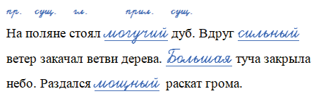 На поляне стоял ___ дуб. Вдруг ___ ветер закачал ветви дерева. ___ туча закрыла небо. Раздался ___ раскат грома.