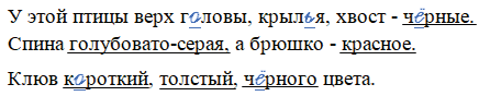 У этой птицы верх г_ловы, крыл_я, хвост - ч_рные. Спина голубовато-серая, а брюшко - красное. Клюв к_роткий, толстый, ч_рного цвета.