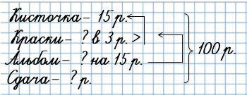 22. Косте надо купить альбом для рисования, набор красок и кисточку. Сколько рублей сдали получит Костя со 100 р., если кисточка стоит 15 р., набор красок в 3 раза дороже, чем кисточка, а альбом на 15 р. дешевле красок?