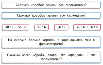 8. 1) Прочитай условие задачи: 48 карандашей разложили по 6 карандашей в каждую коробку, а 56 фломастеров - по 8 фломастеров в каждую коробку.