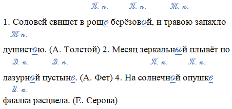 1. Соловей свищет в рощ_ берёзов_й, и травою запахло душист_ю. (А. Толстой) 2. Месяц зеркальн_й плывёт по лазурн_й пустын_. (А. Фет) 4. На солнечн_й опушк_ фиалка расцвела. (Е. Серова)