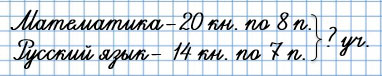 6. В библиотеку привезли 8 пачек учебников математики, по 20 книг в каждой, и 7 пачек учебников русского языка, по 14 книг в каждой. Сколько всего учебников математики и русского языка привезли в библиотеку?