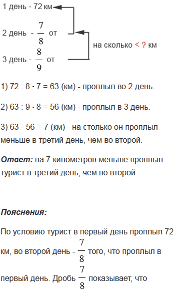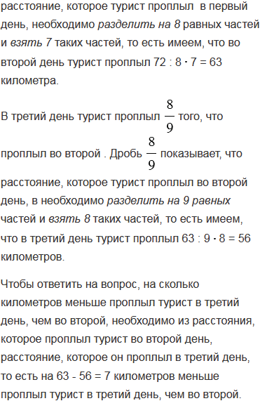 того, что проплыл во второй. На сколько километров меньше проплыл турист в третий день, чем во второй?