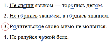 1. Не сп_ши языком — тор_пись дел_м. 2. Не г_рдись зван_ем, а г_рдись знанием. 3. Р_дительск_е слово мимо не молвится. 4. Не радуйся ч_жой беде.