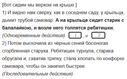 1) И видно нам сверху, как в соседнем саду, у крыльца, дымит трубой самовар. А на крыльце сидит старик с балалайкою, и возле него толпятся ребятишки.