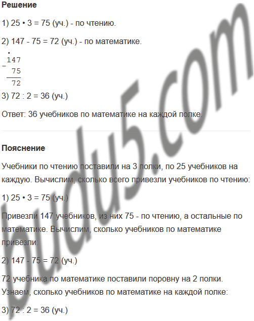 2. В библиотеку привезли учебники по математике и чтению, всего 147 учебников. Учебники по чтению поставили на 3 полки, по 25 учебников на каждую. Учебники по математике поставили поровну на 2 полки. Сколько учебников по математике на каждой полке?