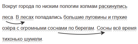 Вокруг города по низким пологим холмам раскинулись леса. В лесах попадались большие луговины и глухие озёра с огромными соснами по берегам. Сосны всё время тихонько шумели. (По Ю. Казакову)