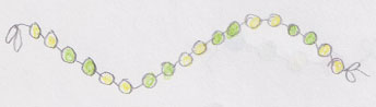 Последовательность цветов: два жёлтых, два зелёных, два жёлтых, два зелёных и т. д. После последнего зелёного кружка следующие нужно раскрашивать в таком порядке цветов, начиная с жёлтых.