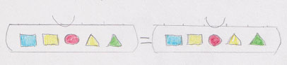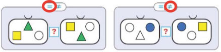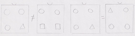 Между двумя группами слева надо поставить знак не равно (не совпадают белый квадрат-красный квадрат, а также белый треугольник-красный треугольник), а между двумя группами справа - равно (потому что они полностью состоят из одних и тех же предметов тех же цветов).