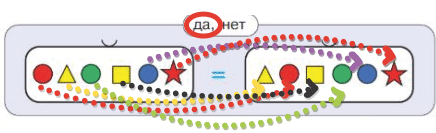Слева в обеих совокупностях одинаковые элементы: зелёный треугольник, жёлтый квадрат, белый круг.