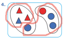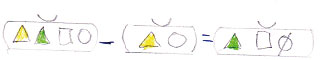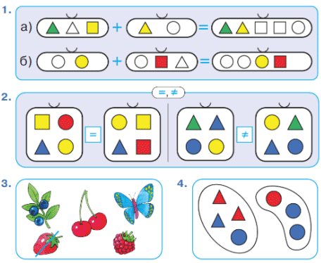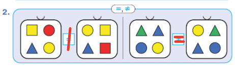 В левом варианте совпадают жёлтый квадрат, жёлтый круг и синий треугольник, а другие фигуры нет, это неравенства. В правом варианте совпадают все фигуры, это равенства.