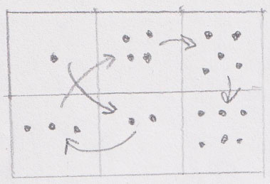 Первым стоит человечек в жёлтом костюме в синюю точку. Поэтому на схеме он отмечен одной точкой.