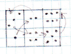 Вторым стоит человечек в костюме в сине-оранжевую клеточку. Поэтому на схеме он отмечен двумя точками.