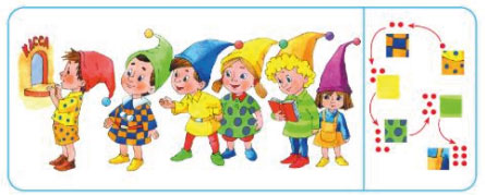 Последним стоит человечек в синей кофте и оранжевом сарафане. Поэтому на схеме он отмечен шестью точками.
