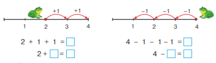 К числу 2 присчитали 2 единицы, от числа 4 отсчитали 3 единицы.