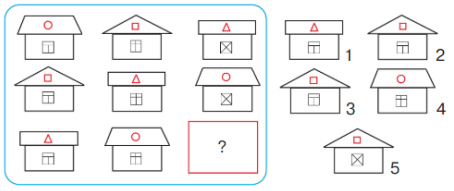 Значит, на месте пропущенного домика должна быть треугольная крыша с квадратом и окно с разделением в виде буквы Х.