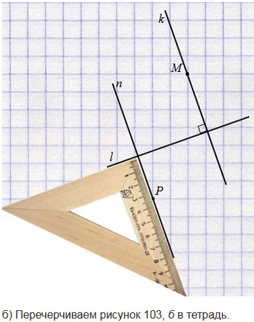 Перечертите рисунок 103 в тетрадь. Проведите через точки М и Р прямые, перпендикулярные прямой