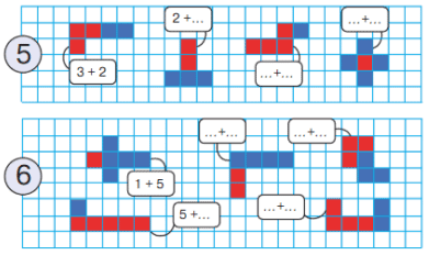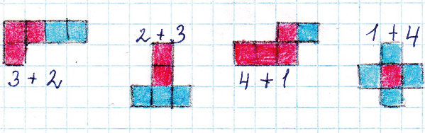 Количество закрашенных клеток одного цвета обозначает одно слагаемое, количество клеток другого цвета - другое слагаемое. Количество клеток в одной фигуре - результат выражения.