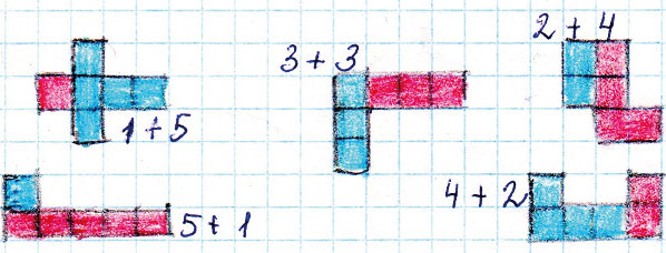 6. Составь три фигуры разной формы из 6 клеток каждая. Раскрась части фигур так, чтобы получились выражения