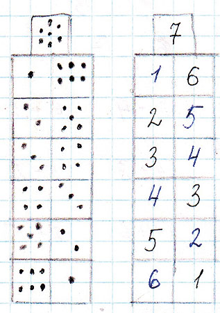 Нужно доставить в пустые клетки так, чтобы сумма точек и цифр равнялась числу 7.