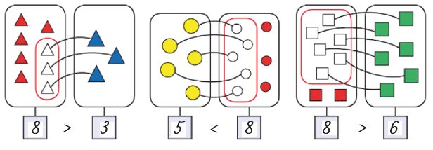 | 4 < 8 | 5 + 3 > 7 | 7 + 1 = 2 + 6 |
