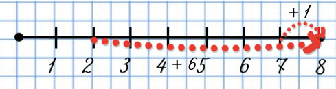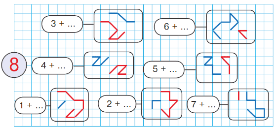 Количество звеньев синей ломаной - первое слагаемое, количество звеньев красной ломаной - второе слагаемое. Сумма всех выражений равна 8.