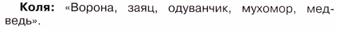 Коля: "Ворона, заяц, одуванчик, мухомор, медведь".