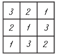 7. Начерти квадрат из 9 клеток. Запиши в каждой клетке квадрата число 1, 2 или 3 так, чтобы сумма чисел в каждой строке и каждом столбце равнялась 6.