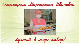 Скорлецкая Маргарита Ивановна – самый лучший повар. Мы из-за её вкусных блюд, ароматных пирожков и булочек с нетерпением ждём времени школьного обеда. Она всегда улыбается. Маргарита Ивановна такая добрая. Спасибо Маргарите Ивановне за её вкусные обеды!