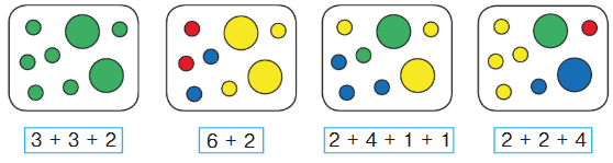 3 картинка - 3 жёлтых круга, 3 синих круга и 2 зелёных круга.