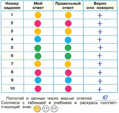 Выполняя задания учебника, заполняем таблицу. В столбце "Мой ответ" закрашиваем кружок в тот цвет, который, на наш взгляд, соответствует правильному ответу. В столбце "Правильный ответ" закрашиваем кружки так, как показано на "Страничках для самопроверки". Сравниваем эти два столбца и заполняем третий: если наш ответ правильный, ставим знак "+", если неправильный – знак "-".