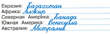 2. Используя карту в учебнике, приведи примеры стран, расположенных на разных материках. (Напиши одно название в каждом пункте).