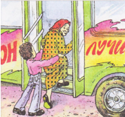 Мальчик помогает старушке подняться в автобус. Он соблюдает правила.