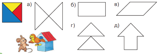 6. Нарисуй на клетчатой бумаге квадрат со стороной 2 см. Раскрась его, как показано на рисунке. Вырежи части квадрата и сложи фигуры.