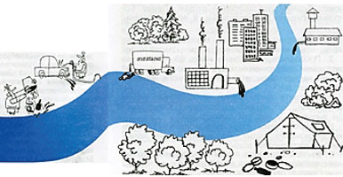 На схеме показаны источники загрязнения воды: мытьё машин из реки, выбрасывание в реку мусора, слив сточных вод заводов и фабрик, нечистоты с ферм, мусор на берегу, оставленный туристами, слив в реку нефтепродуктов, слив воды, использованной в быту.