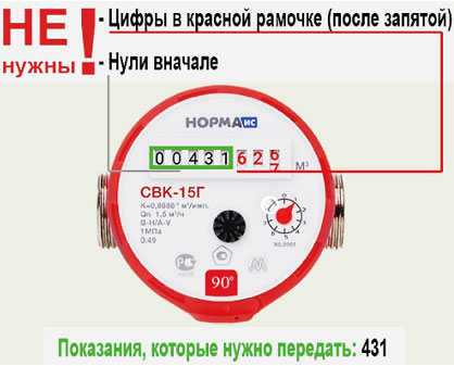 Родители показали мне, где находятся показания на водосчётчике, как нужно их записывать в квитанцию об оплате за воду. Не нужно записывать нули, которые находятся вначале и цифры, которые находятся в красной рамочке.