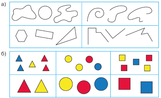 8. Найди общий признак фигур по строкам и столбцам таблиц: