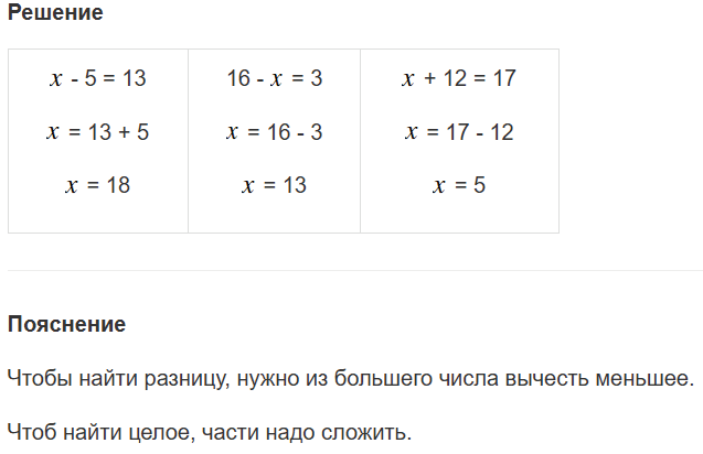 | х - 5 = 13 | 16 - х = 3 | х + 12 = 17 |