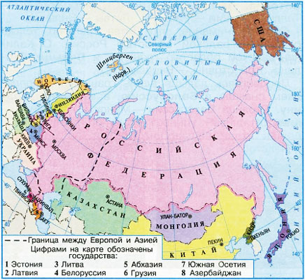 Россия граничит со странами: КНДР, Китай, Монголия, Казахстан, Азербайджан, Южная Осетия, Грузия, Абхазия, Украина, Белоруссия, Польша (граничит с Калининградской областью России), Литва (граничит с Калининградской областью России), Латвия, Эстония, Финляндия, Норвегия.