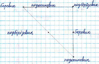 12. Таня нашла 2 боровика, 2 подберёзовика и 2 подосиновика. Она расположила их вдоль трёх отрезков так, что в каждом ряду было по одному грибу каждого вида. Найди свой вариант. Отрезки можно располагать, как захочешь.