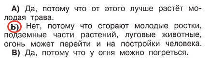 Б) Нет, потому что сгорают молодые ростки, подземные части растений, луговые животные, огонь может перейти и на постройки человека.