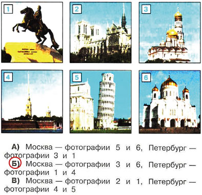 Б) Москва – фотографии 3 и 6, Петербург – фотографии 1 и 4