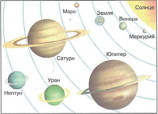 Рассмотрите схему. Найдите Солнце и планеты. Мысленно достройте схему так, чтобы представить себе Солнце полностью, а планеты обращающимися вокруг него. Учтите, что планеты движутся по немного вытянутым орбитам.